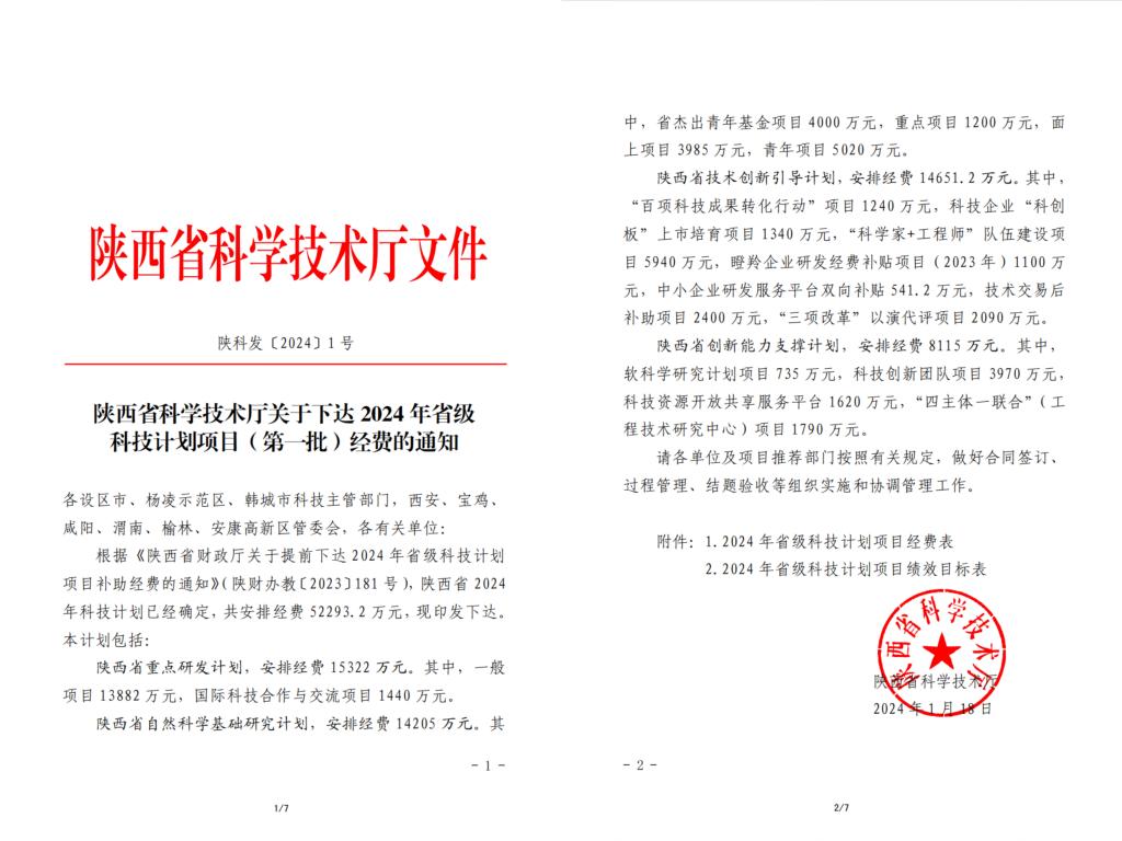 日前,陕西省科学技术厅发布了《陕西省科学技术厅开云online(中国)下达2024年省级科技计划项目(第一批)经费的通知》(陕科发〔2024〕1号),开云手机官方网站共申报2024年度陕西省科技计划项目(第一批)163项,第一批次获批项目49项,立项经费总额326万元,和上一年度相比,立项数量增长18%,立项金额增长29%,平均资助率达30%。其中,获批省自然科学基础研究计划项目35项、陕西省重点研发计划项目(一般项目和国际科技合作与交流计划)11项、省创新....