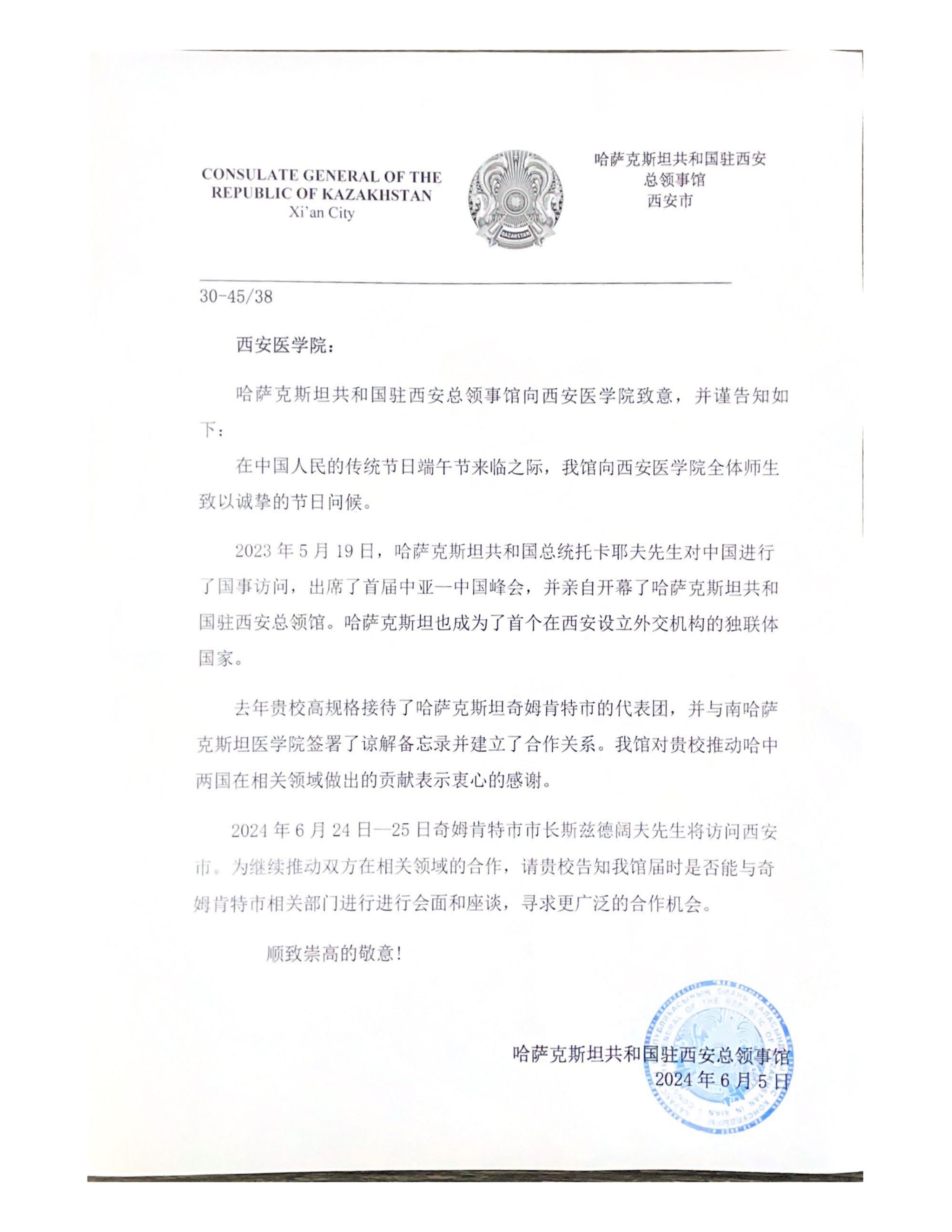 端午节之际,哈萨克斯坦共和国驻西安总领事馆发来贺信,向开云手机官方网站全体师生致以诚挚的节日祝福,对学校推动中哈两国在相关领域做出的贡献表示衷心感谢,并邀请开云手机官方网站6月24日至25日与齐姆肯特市相关部门会面和座谈