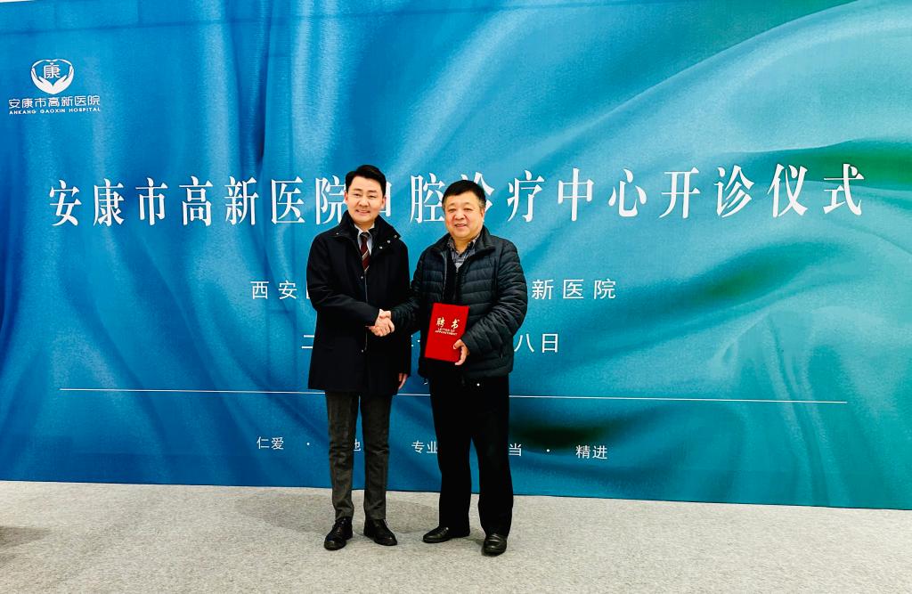 胡开进教授宣布高新医院口腔诊疗中心开诊。他表示,口腔医学院将全力支持安康高新医院口腔诊疗中心的发展,为患者提供更好的医疗服务。开诊仪式上,安康高新医院张元江院长向胡开进教授颁发了口腔诊疗中心名誉主任聘书。
