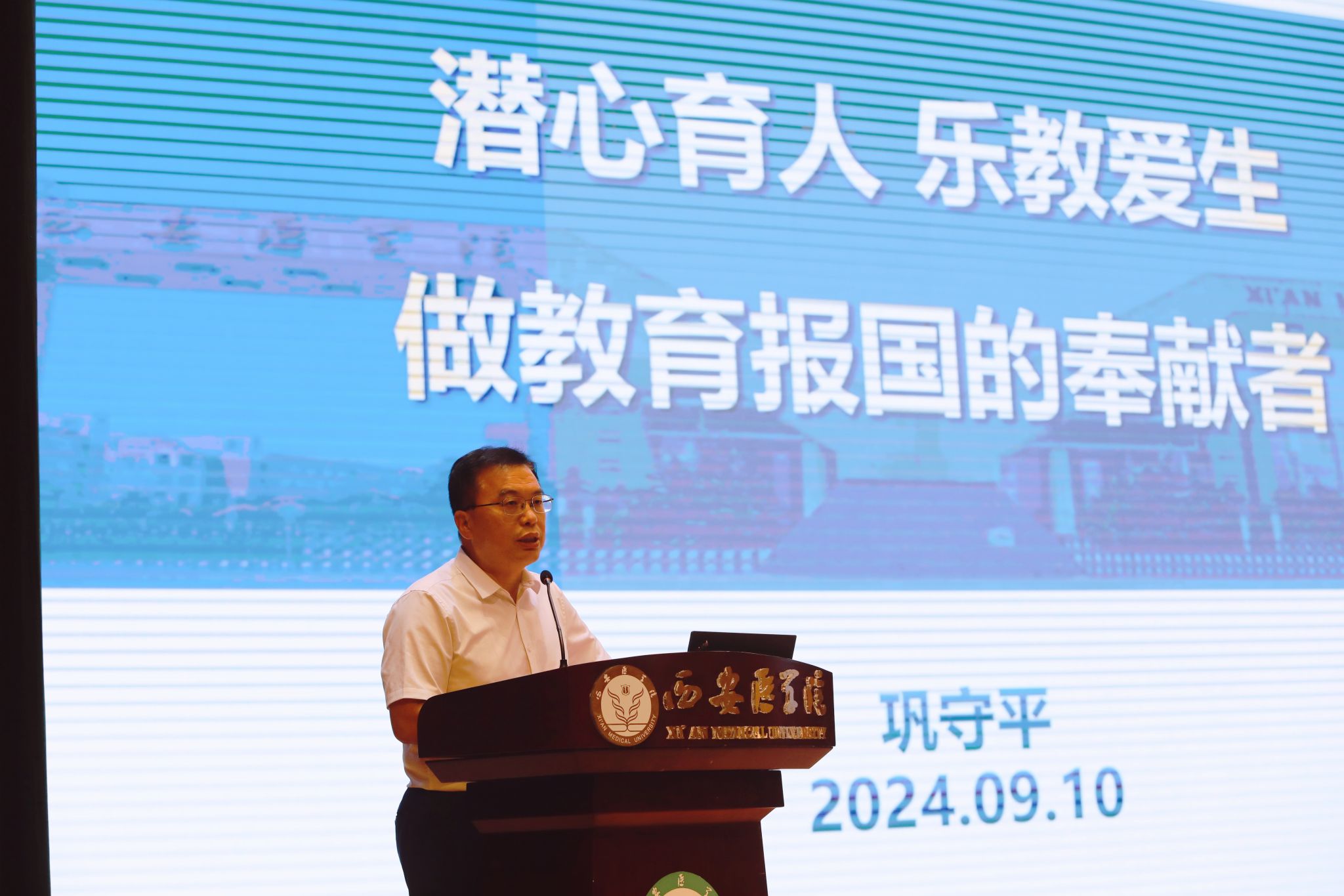 巩守平作“潜心育人乐教爱生做教育报国的奉献者”主题讲话,向全校广大教师和教育工作者致以节日的问候和崇高的敬意,向受到表彰的优秀教师、教育工作者和先进集体表示热烈的祝贺。他指出,过去一年,学校全体教职员工凝心聚力、攻坚克难,推动各项事业平稳有序发展,取得了良好成绩。今后更要铆足“逆水行舟、不进则退”的干劲,做投身三尺讲台的教学能手、上下求索的学界先锋,护佑生命的医者楷模,为书写学校高质量发展新篇章留墨添彩。